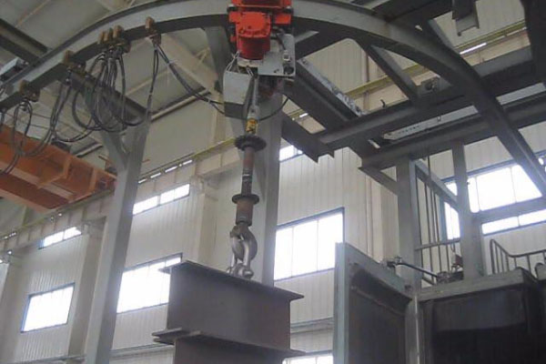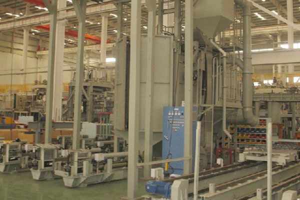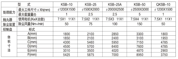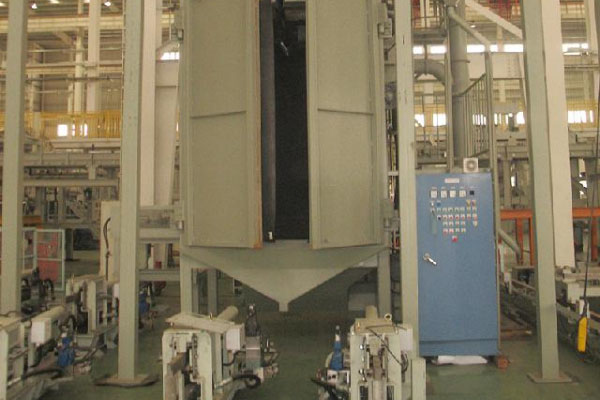 本機為吊鉤式清理設備。采用拋丸清理去掉表面型砂及氧化皮,獲得具有一定粗糙度的表面,以改善其表面質(zhì)量。主要由制品搬送裝置、清理室、清理室門、彈丸循環(huán)系統(tǒng)、吊鉤自轉(zhuǎn)、拋丸器、除塵管路、電控系統(tǒng)等部分組成。被清理工件由可升降的電動葫蘆吊鉤吊離地面,并上升到設定的高度,沿著導軌平移到拋丸室中心處。門關(guān)閉后,自轉(zhuǎn)機構(gòu)啟動使吊鉤緩慢旋轉(zhuǎn),此時清理室側(cè)面的拋丸器分別從上下兩個方向?qū)ぜM行拋丸。拋射完了后,吊鉤沿導軌行走,將工件搬送到清理室外。拋丸器在清理室側(cè)面的合理布置使鋼丸可以拋射到工件的各個表面,即使是形狀很復雜的工件也會有很好的清理效果。被拋射出的鋼丸落入下部振動篩,再由下部螺旋將鋼丸輸送到提升機下部,由提升機將鋼丸提升至分離器,粉塵、碎鋼丸、型砂等被分離出來,可以使用的鋼丸流回到拋丸器,拋打下來的芯鐵、飛邊等異物在振動篩前端被篩出,產(chǎn)生的粉塵由除塵器除去。 特點: 1.吊鉤可以水平運行和垂直回轉(zhuǎn),并具有升降功能,方便賬工件裝卸; 2.可靠的密封設計,有效解決了飛丸現(xiàn)象; 3.無地坑,室內(nèi)彈丸直射部位采用硬防護 4.吊鉤運行軌道有多種布置形式可供選擇; 用途: 適用于中大型,形狀復雜及怕碰撞的工件表面的清砂、除銹、去氧化皮;